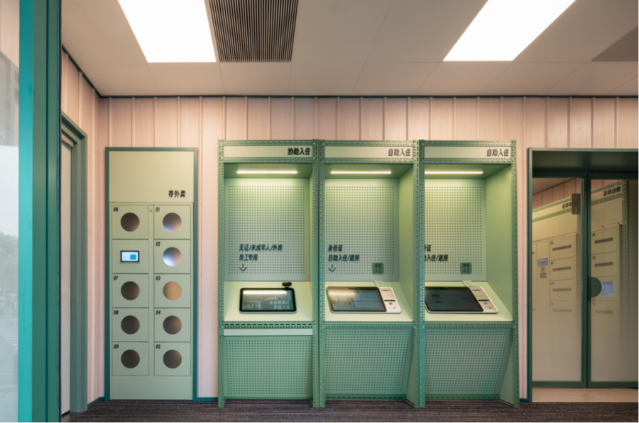 海友以“大堂‘功’区”为核心,以“便捷性”和“安全性”重构空间与系统。入住环节,客人可通过“华掌柜”自助机10秒完成自助入住办理,刷房卡才能进入自助功能区;公区内,行李寄存、衣物洗烘、加热餐食、零食售卖及客用品领取等十大自助设施24小时开放,实现需求即时高效响应。这一简约设计并非简单“无人化”,而是将服务主动权交还客人,酒店随处可见“呼叫人工”的面板标识,客人需要时员工将及时协助,实现了高效便捷与人文关怀的平衡。
